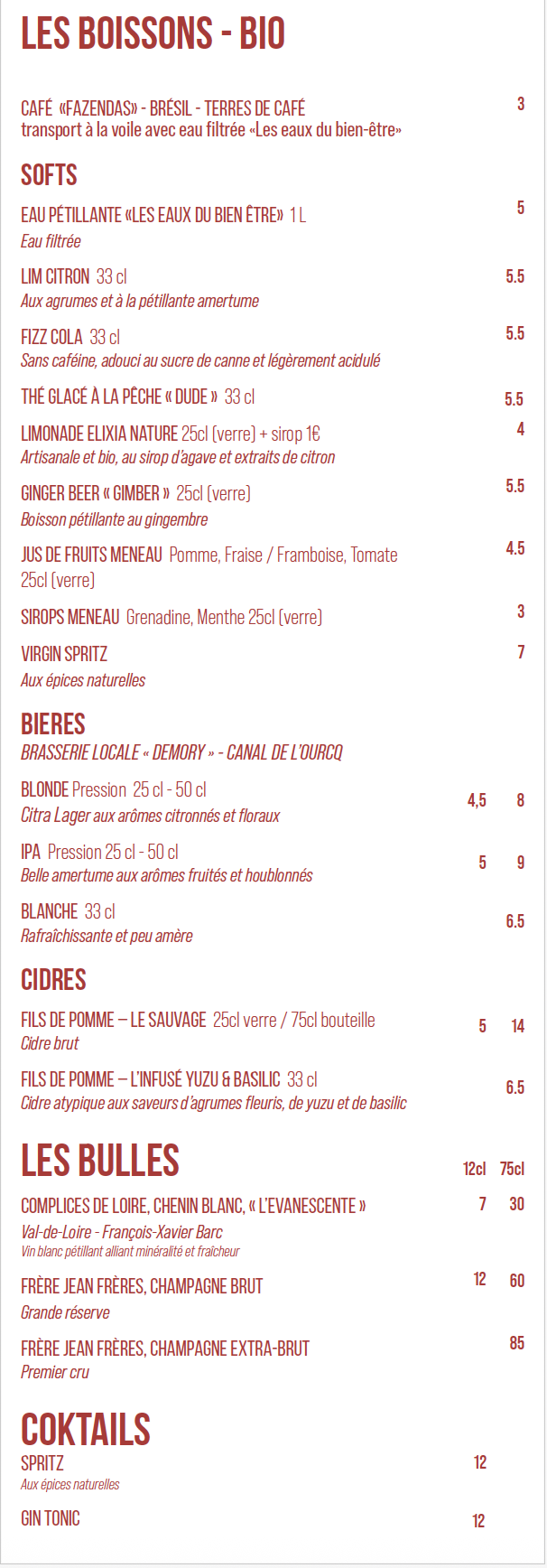 Carte des boissons